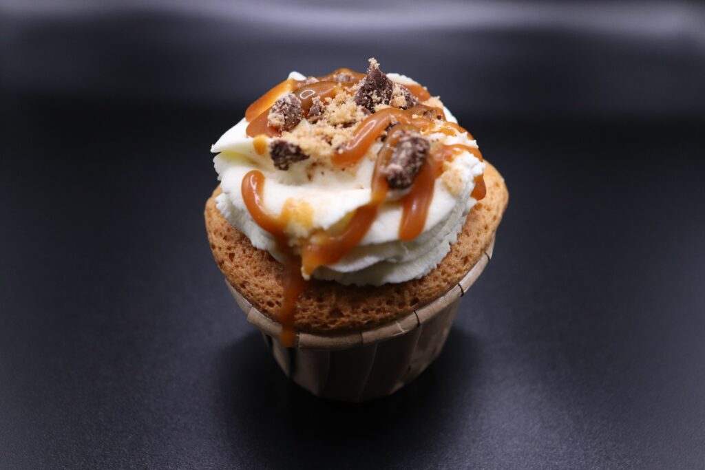 Cupcake cookie caramel salé Cupcake cookie caramel salé Génoise vanille, crème chantilly mascarpone, fourré coulis de caramel salé, cookie.